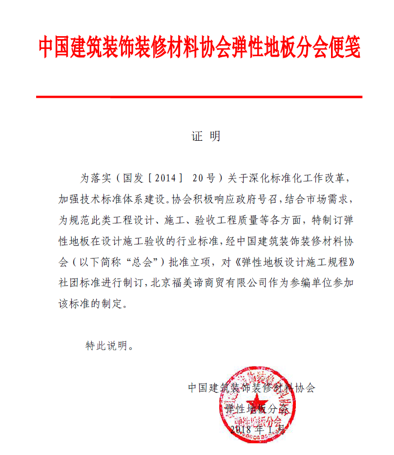 为落实(国发[2014] 20 号)关于深化标准化工作改革,加强技术标准体系建设。协会积极响应政府号召,结合市场需求,为规范此类工程设计、施工、验收工程质量等各方面,特制订弹性地板在设计施工验收的行业标准,经中国建筑装饰装修材料协会(以下简称“总会”)批准立项,对《弹性地板设计施工规程》社团标准进行制订,北京福美谛商贸有限公司作为参编单位参加该标准的制定。